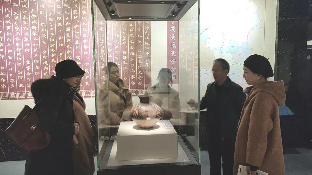 交流团首先走进会宁县博物馆“祖厉陶韵——馆藏史前精品陶器展”,沉浸式领略黄河上游史前文明的璀璨脉络。在葫芦柳叶纹双耳彩陶壶、辛店文化附加堆纹袋足鬲、人头形器盖红陶罐等国家一级文物前,大家驻足细赏,详细了解文物的出土背景、制作工艺与文化内涵,从器型设计到纹饰寓意,从烧窑技术到使用功能,双方围绕展品背后的历史展开深入探讨,在实物观摩中深化了对史前文化演变的认知。