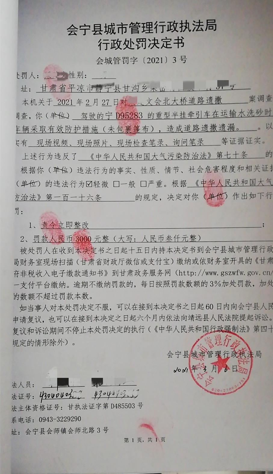 会宁县城市管理行政执法局行政处罚决定书