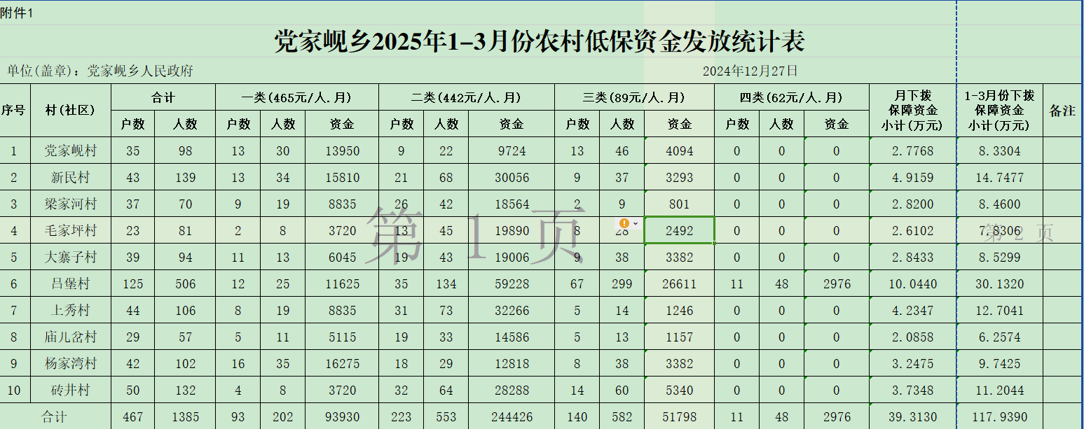党家岘乡人民政府2025年1-3月份农村低保资金发放情况公示