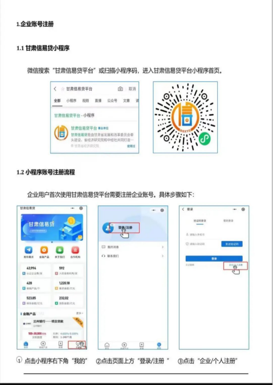 全县广大企业及个体工商户朋友: 为认真贯彻落实省委、省政府关于促进民营经济、中小企业健康发展决策部署,着力解决中小企业融资难、融资贵、融资慢等困难问题,省发展改革委依托省社会信用信息平台,开发、建设了甘肃省中小企业融资综合信用服务平台(以下简称“甘肃信易贷”平台)。“甘肃信易贷”平台集成政府、企业、社会和金融机构各类信用信息,以信用大数据、智能风控等金融科技为支撑,以信用为核心要素,为各类市场主体提供融资综合信用服务,各市场主体可通过平台发布融资需求,根据需求,平台会智能匹配符合需求的金融产品,市场主体也可与金融机构直接在平台进行对接,获取信贷支持,各项操作均在互联网进行,免去企业在银行间的来回奔波。为充分发挥“甘肃信易货”平台服务作用,现倡议全县广大企业及个体工商户朋友积极入驻“甘肃信易货”平台,进一步拓宽融资渠道,体会信用带来的实惠和便利! 会宁县发展和改革局 2023年6月12日 “甘肃省信易贷”平台简介 甘肃省中小企业融资综合信用服务平台(简称“甘肃信易贷”平台),依托甘肃省信用信息共享平台归集的公共信用信息,以大数据、智能风控等金融科技为支撑,以信用为核心要素,深化信用信息共享应用,形成覆盖全国、兼容地方、涵盖多种融资服务模式的一站式服务平台。 一、平台的服务功能 1.金融机构信贷产品展示。金融机构可在平台发布各类相关信贷产品,吸引企业提交融资申请。 2.银企融资智能匹配。企业发起融资需求后通过平台智能匹配合适的金融产品,也可通过定向对金融产品直接发起融资申请,平台将这两类需求发送给相应金融机构,金融机构及时受理企业融资申请,实现银企融资高效对接。 3.企业信用信息查询。经过企业相关授权后,金融机构通过平台查询申请融资企业的信用报告,了解企业信用状况。 二、平台优势 (一)面向市场主体 1.多渠道资金覆盖。涵盖甘肃省内 21 家银行业金融机构和 3家省级担保公司,并发布金融产品 315 项,基本可以满足各类型中小微企业贷款需求。 2.信用服务。综合政府部门信用大数据和市场数据,通过联合建模形成全覆盖、标准化、动态化的公共信用综合评价,为金融机构提供授信参考和信用服务。 3.政府扶持政策配套。通过引入各级政府部门设立的融资扶持政策(信贷风险缓释基金或风险补偿金、贷款贴息、应急周转资金等),建立多层次风险缓释机制。 (二)面向金融机构 1.提供更多维度的大数据支撑。“甘肃信易贷”平台与全国“信易贷”平台等多家平台的互联互通,并与甘肃省投资项目在线审批监管平台实现实时对接;归集企业基本信息 51.3 万户、个体工商户信息 165 万户、92.6 万特定自然人信息,包括红黑名单、行政许可、行政处罚、异常经营、社保、税务等信息。 2.增加金融机构的精准获客能力。利用公共信用综合评价 作为基础授信参考,从平台入口及时拦截低信用、高风险用户,让信用良好的企业提高融资便利可得性,助力金融机构增进与中小企业的信息畅通,降低授信成本,提升金融机构的成功获客以及融资对接转化率。 3.降低中小企业融资风险。通过引入各级政府部门设立的中小企业融资扶持政策(信贷风险缓释基金或风险补偿金、贷款贴息、应急周转资金等),建立多层次风险缓释机制,实现多方共担信贷风险,有效降低金融机构的信贷风险,推进解决“不敢贷、不愿贷”问题。 (三)面向地方政府 1.构建金融服务生态圈。平台涵盖银行(包括全国性银行、 区域性银行和农商行等)、担保、保险等各种金融机构,汇聚社会信用服务示范机构提供丰富多样的信用服务,搭建便捷高效的金融服务超市,打造“政银企信”多方共建、互惠多赢的金融服务生态圈。 2.打造优良营商环境。通过平台实现可视化、个性化监测所辖中小微企业发展和融资情况,掌握金融服务实体经济发展第一手资料,提高精准施策效率;依托甘肃省信用大数据和平台服务闭环,推动政府扶持政策的“线上兑现。甘肃信易贷平台注册流程(小程序端)