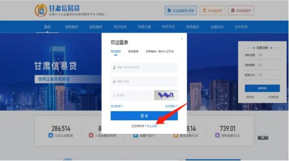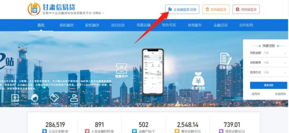 甘肃信易贷平台注册流程(网页端)1.用户首次使用甘肃信易贷平台需要注册账号,在甘肃信易贷平台(网址:https://www.gsxyd.cn/baiyin/index),点击右上角“企业登录/注册”按钮,开始注册。如下图: