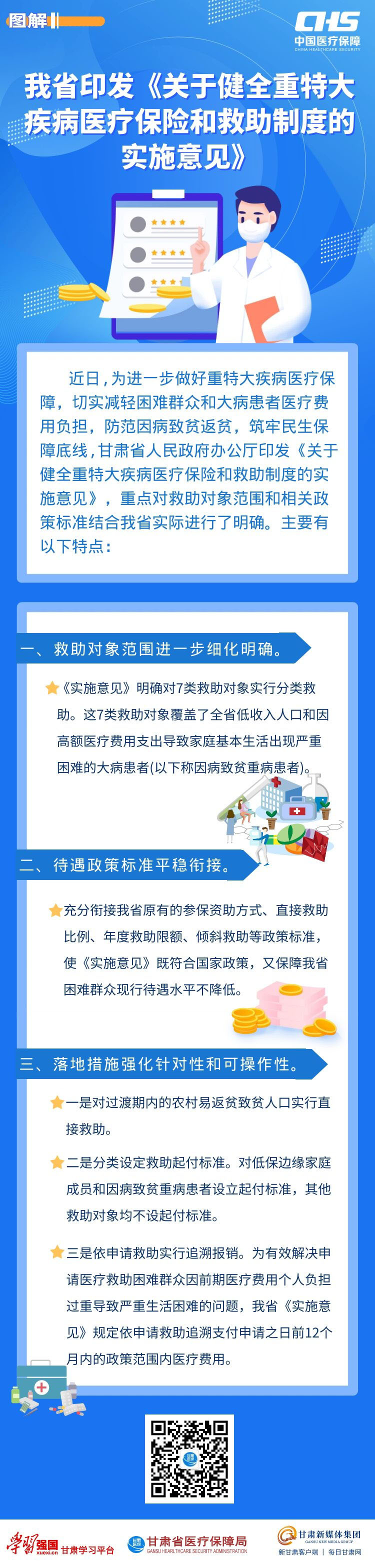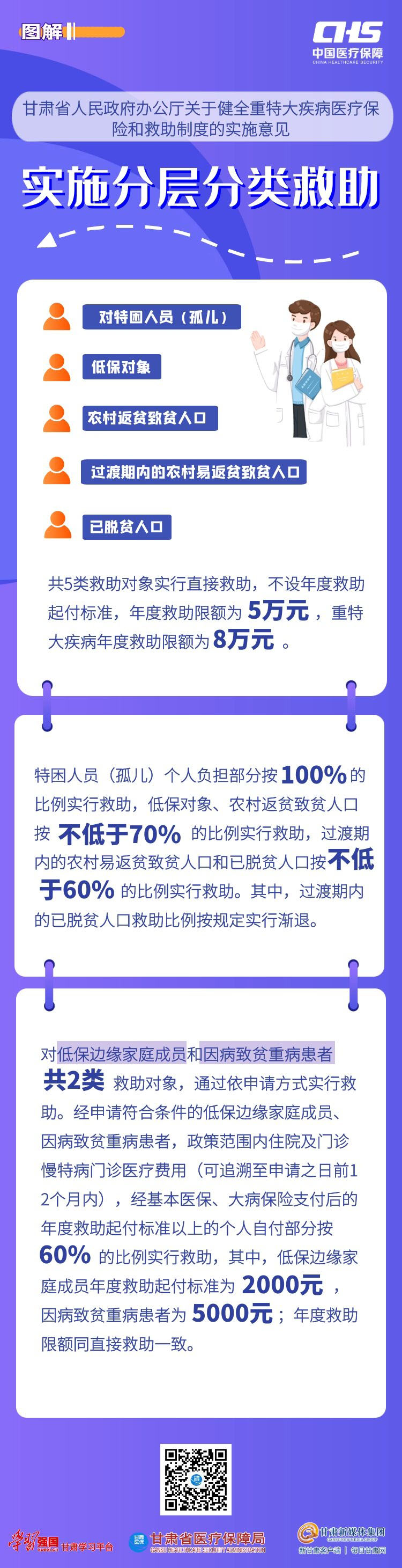 根据《国务院办公厅关于健全重特大疾病医疗保险和救助制度的意见》(以下简称《意见》)及省委、省政府深化医疗保障制度改革的部署要求,2月25日,省政府办公厅印发了《关于健全重特大疾病医疗保险和救助制度的实施意见》(以下简称《实施意见》),以进一步完善多层次医疗保障体系建设为切入,统一规范全省医疗救助制度,确保困难群众基本医疗有保障。 一、出台背景 党的十八大以来,国家加快推进多层次医疗保障制度体系建设,在破解“看病难”“看病贵”问题上取得突破性进展,但随着改革纵深推进,医保制度托底保障功能不足、大病重病患者负担较重问题尚没有彻底解决。2021年10月28日,为深入贯彻落实党中央、国务院关于深化医疗保障制度改革和完善社会救助制度的决策部署,巩固拓展医疗保障脱贫攻坚成果,不断增强人民群众获得感、幸福感、安全感,国务院办公厅印发《意见》,指导各地做好重特大疾病医疗保障,进一步减轻困难群众和大病患者医疗费用负担,防范因病致贫返贫,筑牢民生保障底线。根据国家基本政策和我省实际,省政府办公厅制定印发《实施意见》,细化政策措施,明确责任分工,加强组织保障,要求省内各统筹地区落实主体责任,确保政策落地见效、制度可持续发展、群众得到实惠。 二、我省《实施意见》的主要内容 我省《实施意见》共包括明确医疗救助对象范围、实施综合保障政策、强化医疗救助托底保障功能、建立健全防范和化解因病致贫返贫长效机制、鼓励社会力量参与救助保障、规范经办管理服务、加强组织保障等7部分,主要内容与国家《意见》基本一致,重点对救助对象范围和相关政策标准结合我省实际进行了明确。主要有以下特点: (一)救助对象范围进一步细化明确。国家《意见》明确医疗救助制度公平覆盖医疗费用负担较重的困难职工和城乡居民,使医疗救助制度从面向特定身份人群转变为面向全体参保人员。我省《实施意见》具体将特困人员(孤儿)、城乡低保对象、农村返贫致贫人口、纳入防止返贫致贫监测范围的农村易返贫致贫人口、过渡期内的已脱贫人口、城乡低保边缘家庭成员、因高额医疗费用支出导致家庭基本生活出现严重困难的大病患者 (以下称因病致贫重病患者)等7类人员纳入医疗救助范围。同时,明确了各类救助对象认定职能,分别由民政、乡村振兴等部门依职能认定后,由医保部门实施分层分类救助。 (二)待遇政策标准稳步提升。我省《实施意见》按照“先保险后救助”的原则,在强化基本医保、大病保险、医疗救助三重制度综合保障的同时,坚持全省统一的医疗救助制度内容框架设计,明确救助费用保障范围,充分衔接我省原有的医疗救助方式、救助比例、年度限额、二次倾斜救助等政策内容,使我省各项政策标准既符合国家政策,又保障我省困难群众现行待遇水平稳步提升。其中,继续对特困人员( 孤儿)、低保对象、农村返贫致贫人口、过渡期内的农村易返贫致贫人口和已脱贫人口实行直接救助,不设年度救助起付标准,救助比例为60%至100%。对低保边缘家庭成员和因病致贫重病患者通过依申请方式纳入医疗救助,年度救助起付标准分别为 2000元和5000元,救助比例为60%。直接救助和依申请救助年度救助限额统一为5万元,重特大疾病年度救助限额为8万元。 (三)落地措施强化针对性和可操作性。我省《实施意见》对各项落地机制措施结合我省实际强化了针对性和可操作性,重点细化明确了依申请救助机制,同时要求建立健全高额医疗费用支出预警监测机制和救助帮扶机制,综合考虑经济状况和医疗费用支出情况,动态做好监测人员与分类救助政策的衔接。其中,对低保边缘家庭成员和因病致贫重病患者,通过依申请方式给予救助,低保边缘家庭成员由民政部门认定,因病致贫重病患者将由省民政厅会同省医保局、省财政厅制定具体认定办法;为有效解决申请困难群众因前期医疗费用个人负担过重导致基本生活严重困难的问题,《实施意见》规定依申请救助追溯支付申请之日前12个月内的政策范围内医疗费用,真正做到及时托底,从源头上入手提高医疗救助制度的精准性。