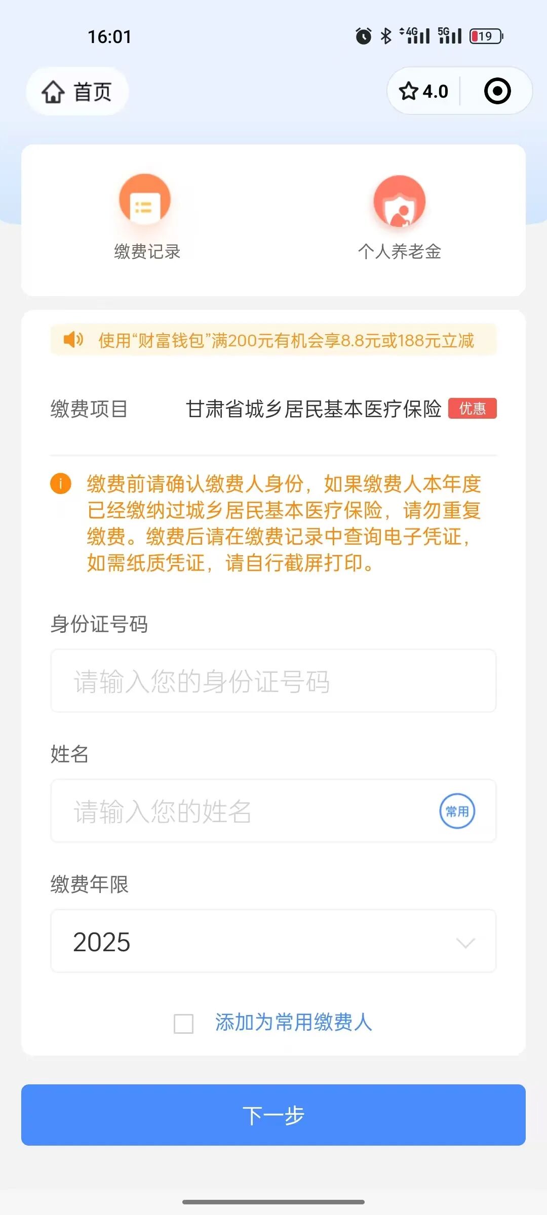缴费方式三 (支付宝缴纳)【支付宝】首页,依次选择“更多→便民生活→市民中心→城市定位到“白银”→社保→居民医保缴费”按要求输入参保居民身份证号、姓名,确认缴费年限“2025”,点击“下一步”→确认身份证号、姓名和缴费金额(不同缴费人群出现的缴费金额不同),确认无误后点击“下一步”→再次确认后,点击“确认缴费”完成支付。缴费完成后,可在“查看缴费记录”中查询电子凭证。缴费方式四(下载手机APP自助在线缴费)下载安装农村信用社联合社、农业银行、邮政储蓄银行、建设银行、光大银行、兰州银行手机APP进行缴费。