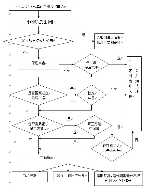 1.答复的期限。行政机关收到政府信息公开申请,能够当场答复的,应当当场予以答复。行政机关不能当场答复的,应当自收到申请之日起20个工作日内予以答复;需要延长答复期限的,应当经政府信息公开工作机构负责人同意并告知申请人,延长的期限最长不得超过20个工作日。行政机关征求第三方和其他机关意见所需时间不计算在答复规定的期限内。