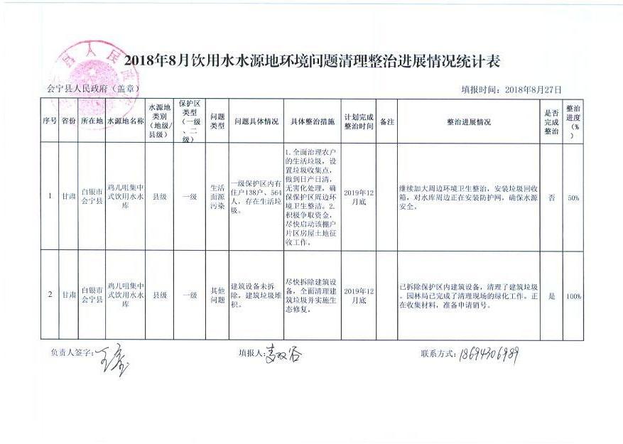2018年8月份饮用水水源地环境问题清理整治进展情况
